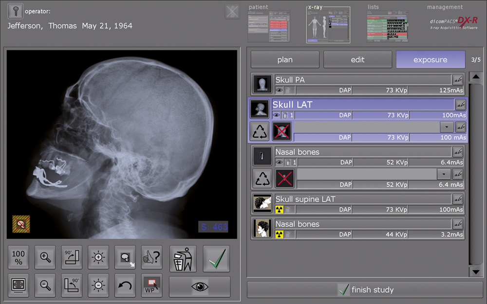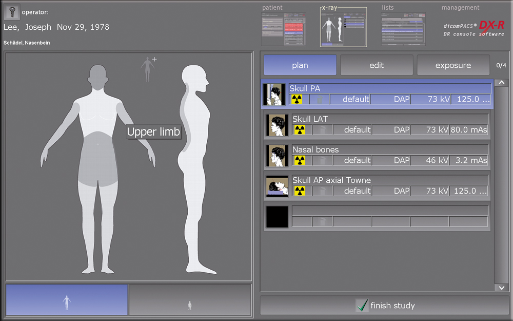 Profesionálny dicomPACS®DX-R akvizičný software exceluje v oblasti intuitívneho a dobre navrhnutého užívateľského rozhrania. Nastavenia rtg. vyšetrení sú účelne vykonané na monitore a akékoľvek nevyhnutné zmeny parametrov sú automaticky prenesené na generátor.